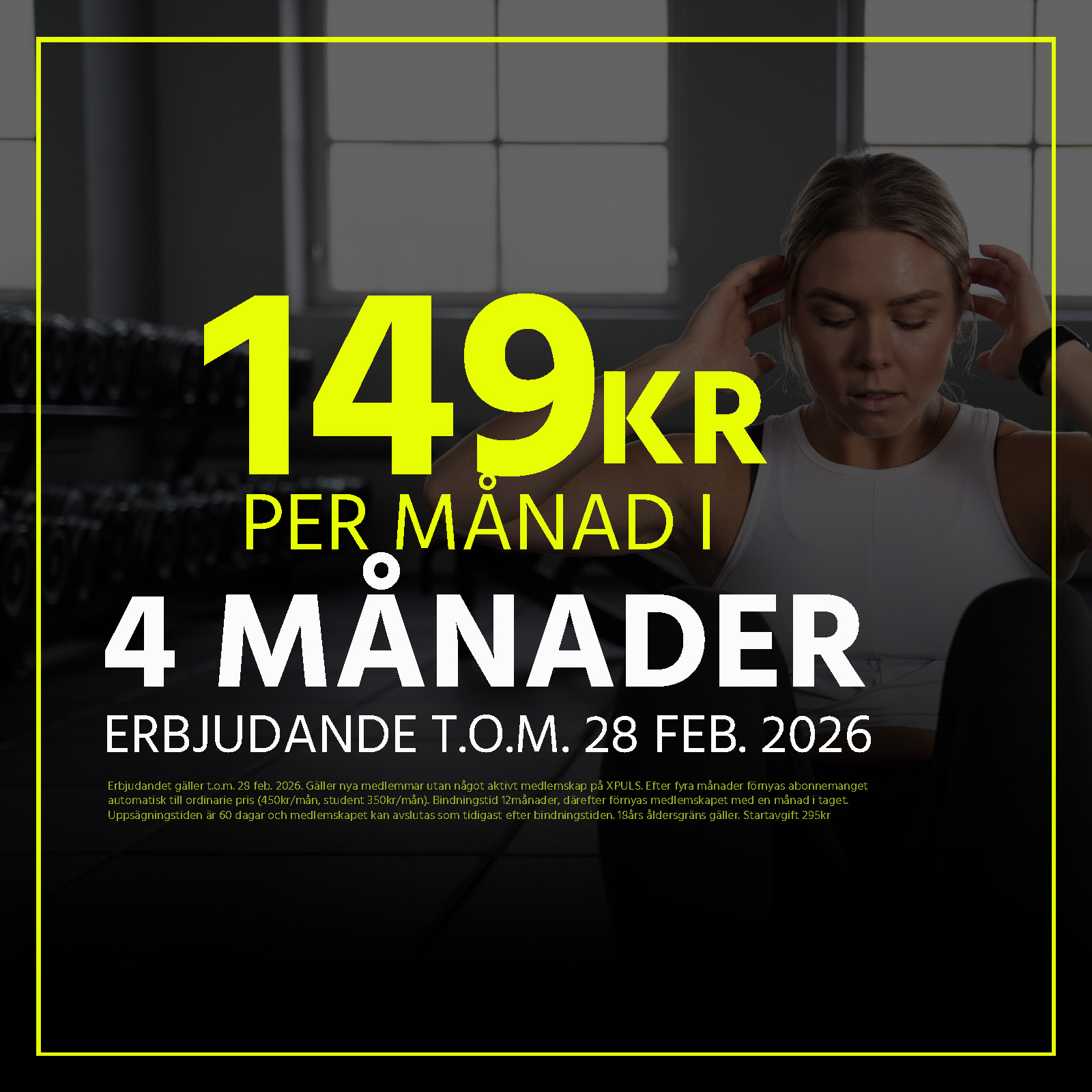 Ambitionen med XPULS har sedan start varit att ge varje medlem förutsättningar att utveckla sin fysiska förmåga på ett roligt och inspirerande sätt. XPULS är tänkt att vara en unik plats för både egentid, gemenskap, uppladdning och urladdning. En plats där du vågar utmana dig själv och fokusera på det som är viktigt för dig i din träning. XPULS har ett gym på 1 200 kvm med ett brett utbud av träningsutrustning. Vi erbjuder även ett stort utbud av styrke- och konditionspass.